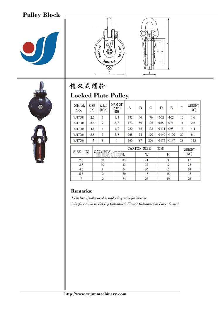 • 產(chǎn)品描述:該滑輪的拉力和尺寸均配合Snatch Block, 互相補(bǔ)充。表面處理為熱鍍鋅,電鍍鋅,噴塑等,均根據(jù)客戶要求。