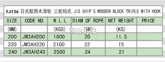 • 產(chǎn)品描述:日式木滑輪同美式木滑輪的標(biāo)準(zhǔn)不一樣,但是其用途是一樣的,都是用于船舶帆桅的升降,因?yàn)槟倔w設(shè)計(jì)既防水防腐,質(zhì)量又輕。主要用于尼龍繩作業(yè)。產(chǎn)品的尺寸從3寸到12寸,適用繩徑從6MM到24MM。