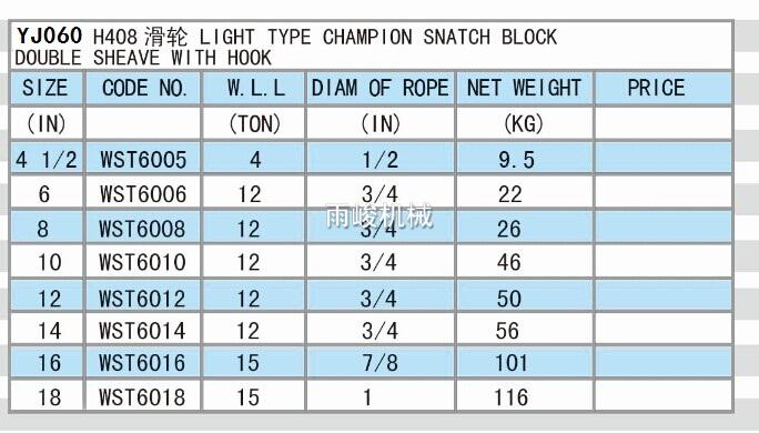 YJ060 LIGHT TYPE CHAMPION SNATCH BLOCK DOUBLE SHEAVE WITH HOOK