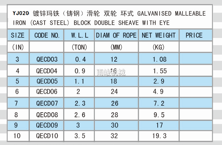 YJ020 GALVANISED MALLEABLE IRON (CAST STEEL)BLOCK DOUBLE SHEAVE WITH EYE - copy