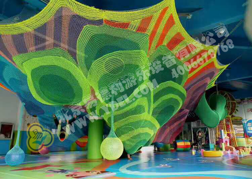巨大的異形彩虹繩網(wǎng),懸在空中占據(jù)空中大部空間,區(qū)別于彩虹樹設(shè)計直上直下,而是猶如一個大溶洞彩色熔巖,環(huán)環(huán)連接,從這邊入口一直爬到房間另一邊網(wǎng)繩架,奇趣無窮。