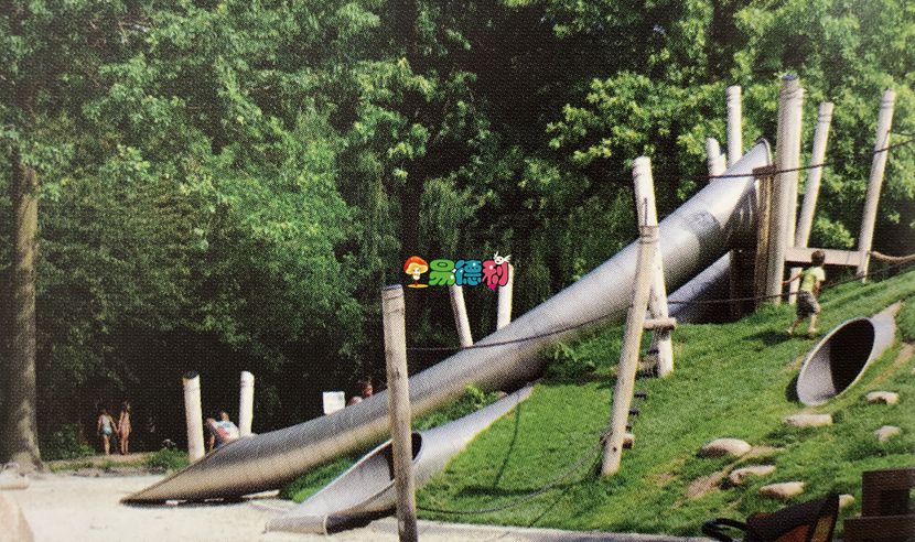 一個人工的小山丘融入了兩種完全不同的游樂設(shè)施: 其中一邊是一個草地斜坡,配有滑梯、隧道和其他冒險游樂設(shè)施; 而在另外一邊,卻是一