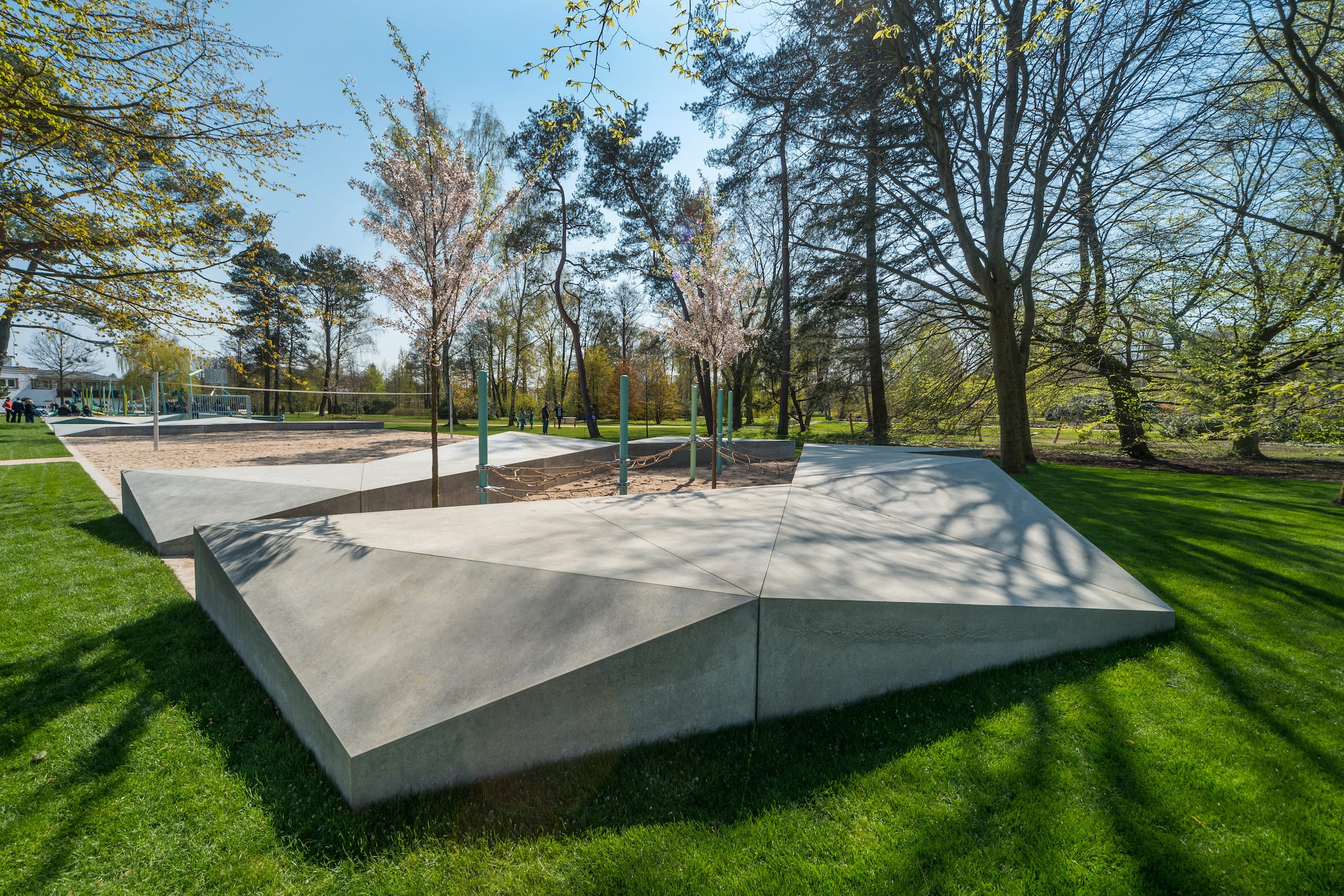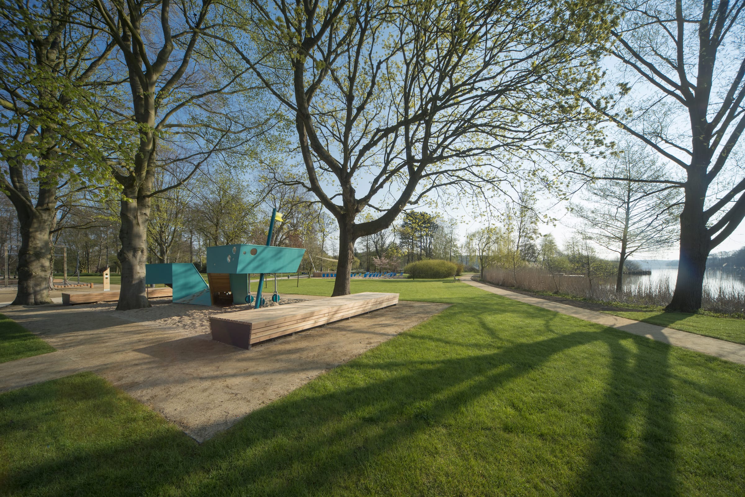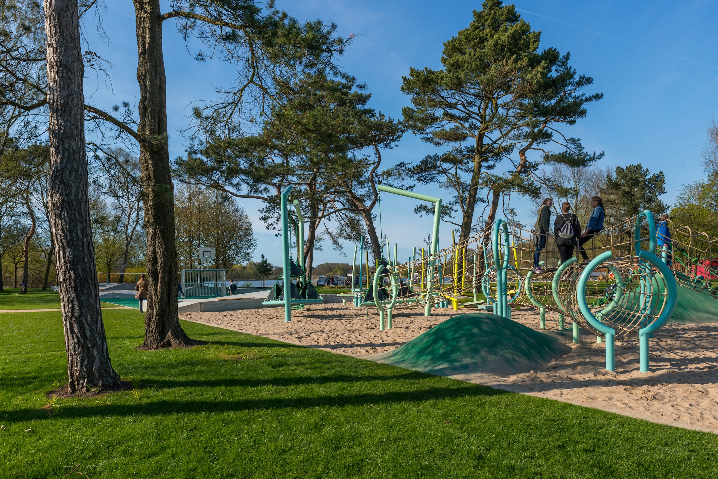 作為與歷史悠久的Schlossgarten公園形成對比的一個景觀,Seepark已發(fā)展成為一個娛樂性的景觀,為家庭、兒童和青少年提供了各種各樣的活動空間,緩解了以前對地標保護花園的過度使用。除了開闊的放松區(qū)域,它還提供了許多戶外活動機會,為兒童和青少年舉辦講習班,設(shè)計他們自己的游戲和運動場地。沙灘上有日光浴區(qū),也有沙灘排球和街球的場地。“湖泊”和“森林”的主題是在一個多層面的、挑戰(zhàn)性的面向兒童的游戲世界中體現(xiàn)的,這為他們的感官而打造:攀爬可以測試他們的平衡和靈活性;網(wǎng)狀隧道像魚網(wǎng)一樣伸展,覆蓋在模型塑料表面;帶有擋泥板的松緊繩索也可以攀爬;移動的柱子創(chuàng)造了一個“搖擺的森林”;樹屋正在建造中。整個公園都有野餐和燒烤的地方。