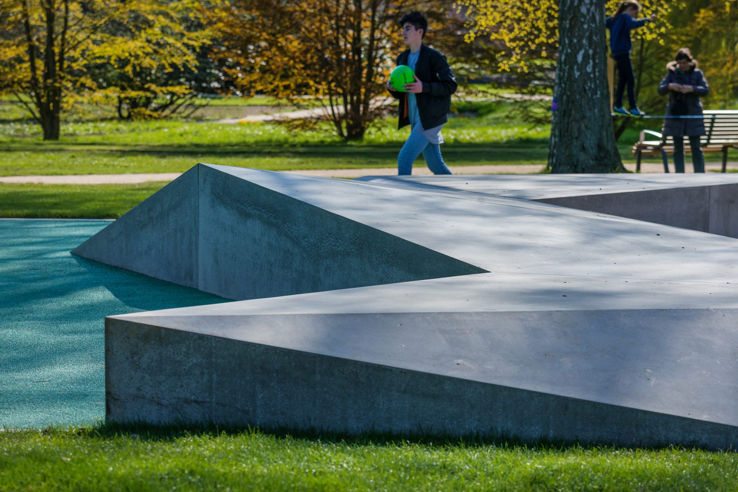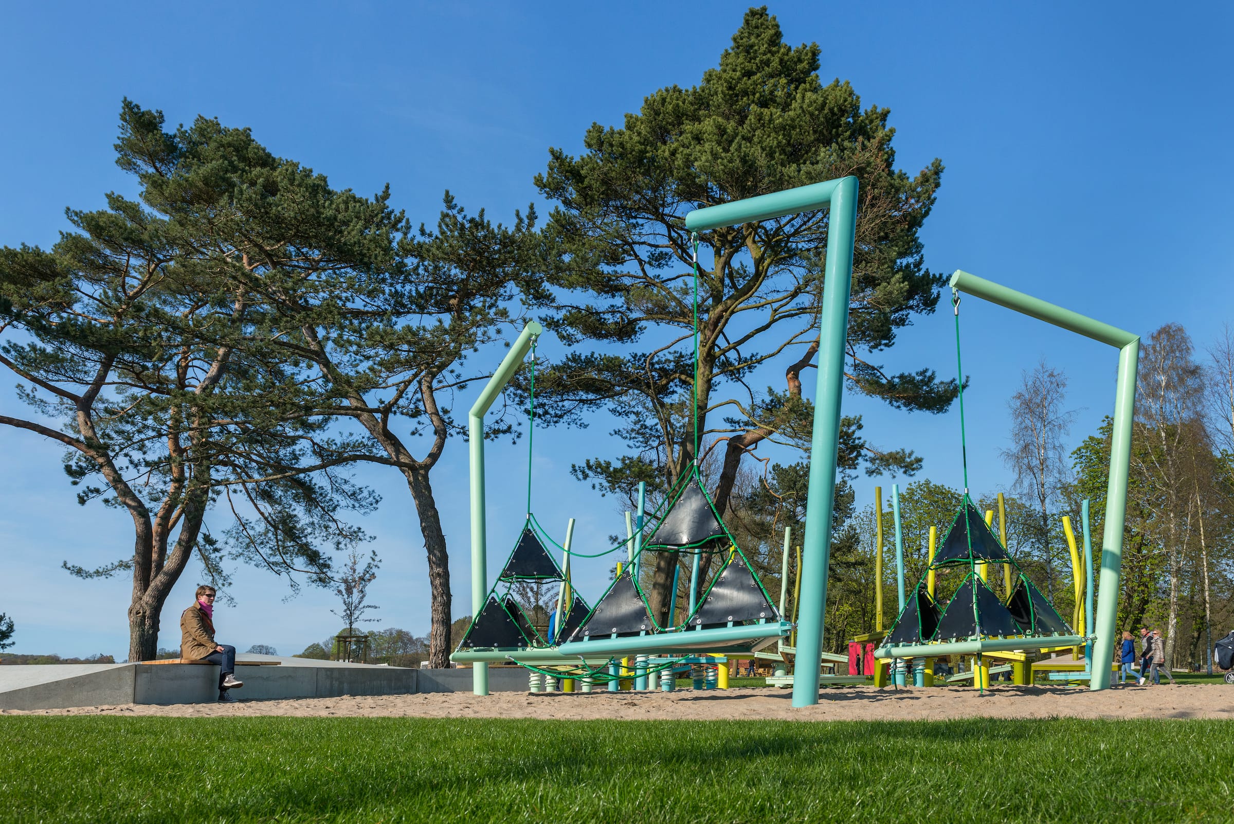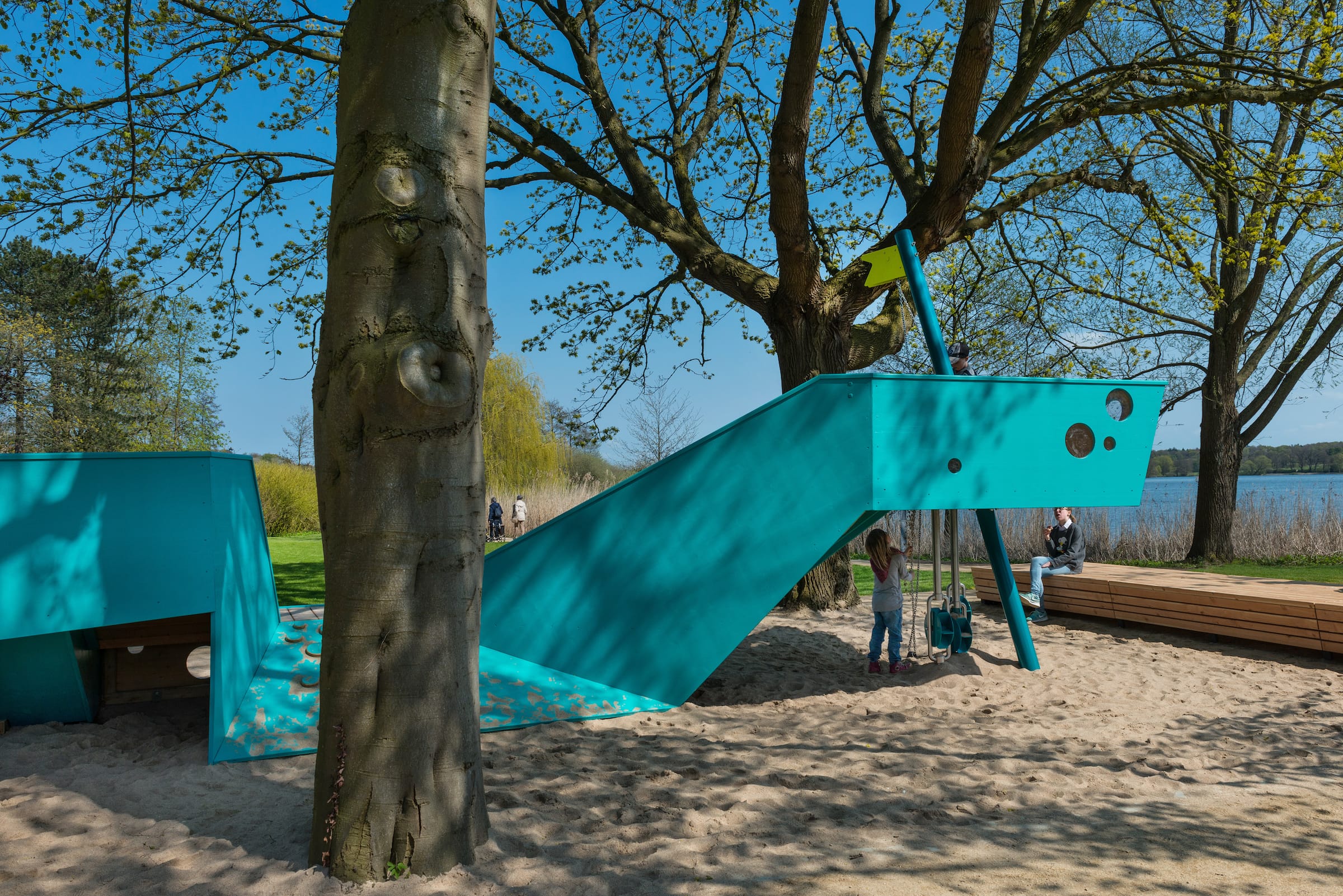 作為與歷史悠久的Schlossgarten公園形成對比的一個景觀,Seepark已發(fā)展成為一個娛樂性的景觀,為家庭、兒童和青少年提供了各種各樣的活動空間,緩解了以前對地標保護花園的過度使用。除了開闊的放松區(qū)域,它還提供了許多戶外活動機會,為兒童和青少年舉辦講習班,設(shè)計他們自己的游戲和運動場地。沙灘上有日光浴區(qū),也有沙灘排球和街球的場地。“湖泊”和“森林”的主題是在一個多層面的、挑戰(zhàn)性的面向兒童的游戲世界中體現(xiàn)的,這為他們的感官而打造:攀爬可以測試他們的平衡和靈活性;網(wǎng)狀隧道像魚網(wǎng)一樣伸展,覆蓋在模型塑料表面;帶有擋泥板的松緊繩索也可以攀爬;移動的柱子創(chuàng)造了一個“搖擺的森林”;樹屋正在建造中。整個公園都有野餐和燒烤的地方。
